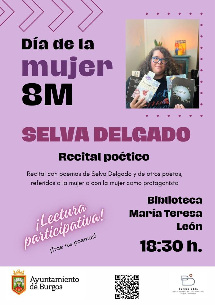 El próximo día 8 de marzo a las 18:30 h., Selva Delgado  ofrece un recital poético en la Biblioteca María Teresa León para celebrar el Día de la Mujer.