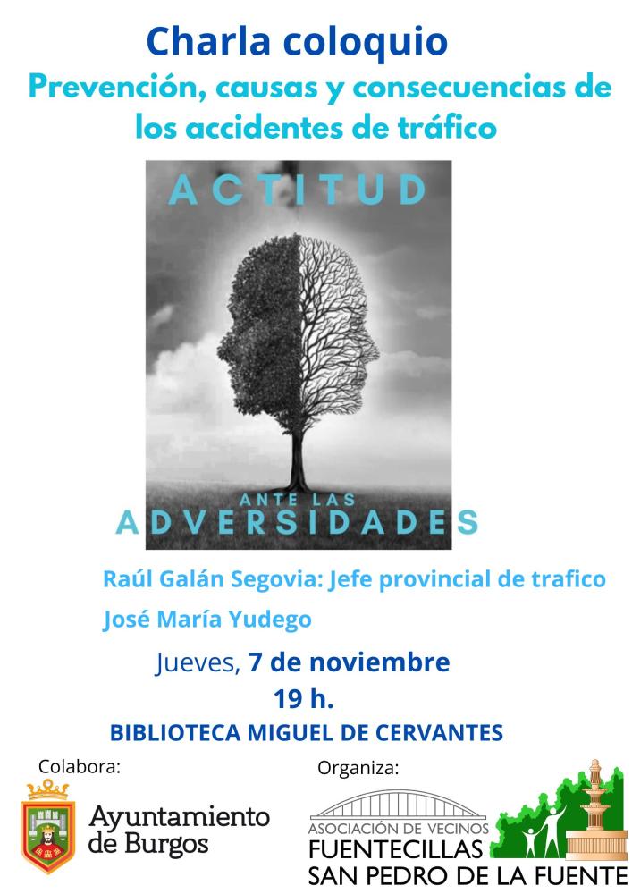 La Asociación de Vecinos San Pedro de la Fuente-Fuentecillas organiza la charla-coloquio "Prevención, causas y consecuencias de los accidentes de tráfico"en la biblioteca Miguel de Cervantes el jueves 7 de noviembre a las 19 h.