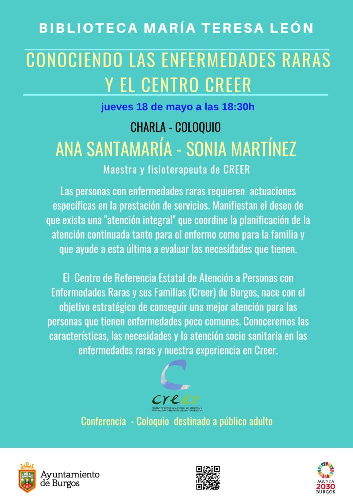 El jueves 18 de mayo a las 18:30 h., Ana Santamaria Herrera (maestra) y Sonia Martínez (fisioterapeuta) impartirán una charla-coloquio bajo el título Conociendo las enfermedades raras y el Centro CREER , dentro de la IV Semana de la Salud y el Bienestar en la Biblioteca «María Teresa León».