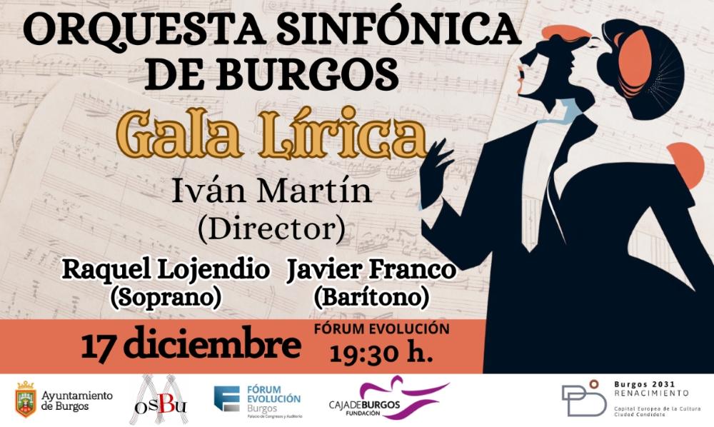 Domingo 17 de diciembre de 2023. 19:30 h. GALA LÍRICA. Orquesta Sinfónica de Burgos. Soprano: Raquel Lojendio. Barítono: Javier Franco. Castañuelas: Ryan Borges. Director: Iván Martín. Oberturas y arias de ópera. Preludios y romanzas de zarzuela. Valses y polkas de Strauss. Fórum Evolución Burgos (Sala Auditorio Rafael Frühbeck de Burgos). Entrada: 20 € (+ comisión de venta por internet ). Temporada 2023-2024 (2º concierto de abono). Programación conjunta Ayuntamiento de Burgos y Fundación Caja de Burgos