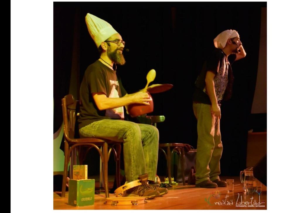 “Fábulo y Leyenda, cocineros del país de los cuentos, llegan con su maleta Enriqueta cargada de utensilios para cocinar historias a fuego lento. Dos gorros de cocinero, un par de cucharas que hacen música, la cacerola y la pandereta Julieta, servirán para que la imaginación y las palabras nos transporten al mundo encantador de la tradición.