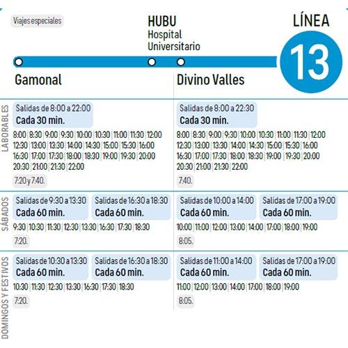 Línea 13: Gamonal - HUBU - Divino Valles Itinerario Icono Mapa Consulta el Itinerario en Directo Horario Documents LINEA_13.pdf (pdf 29,8 kB)